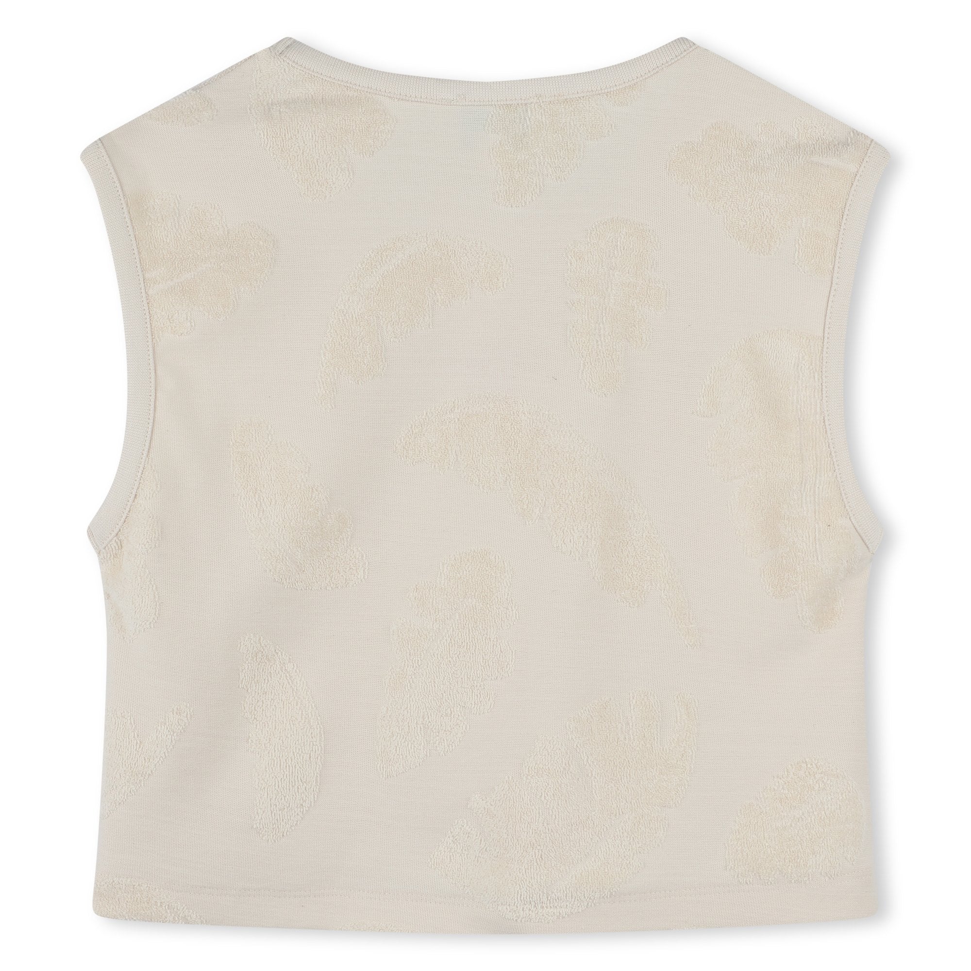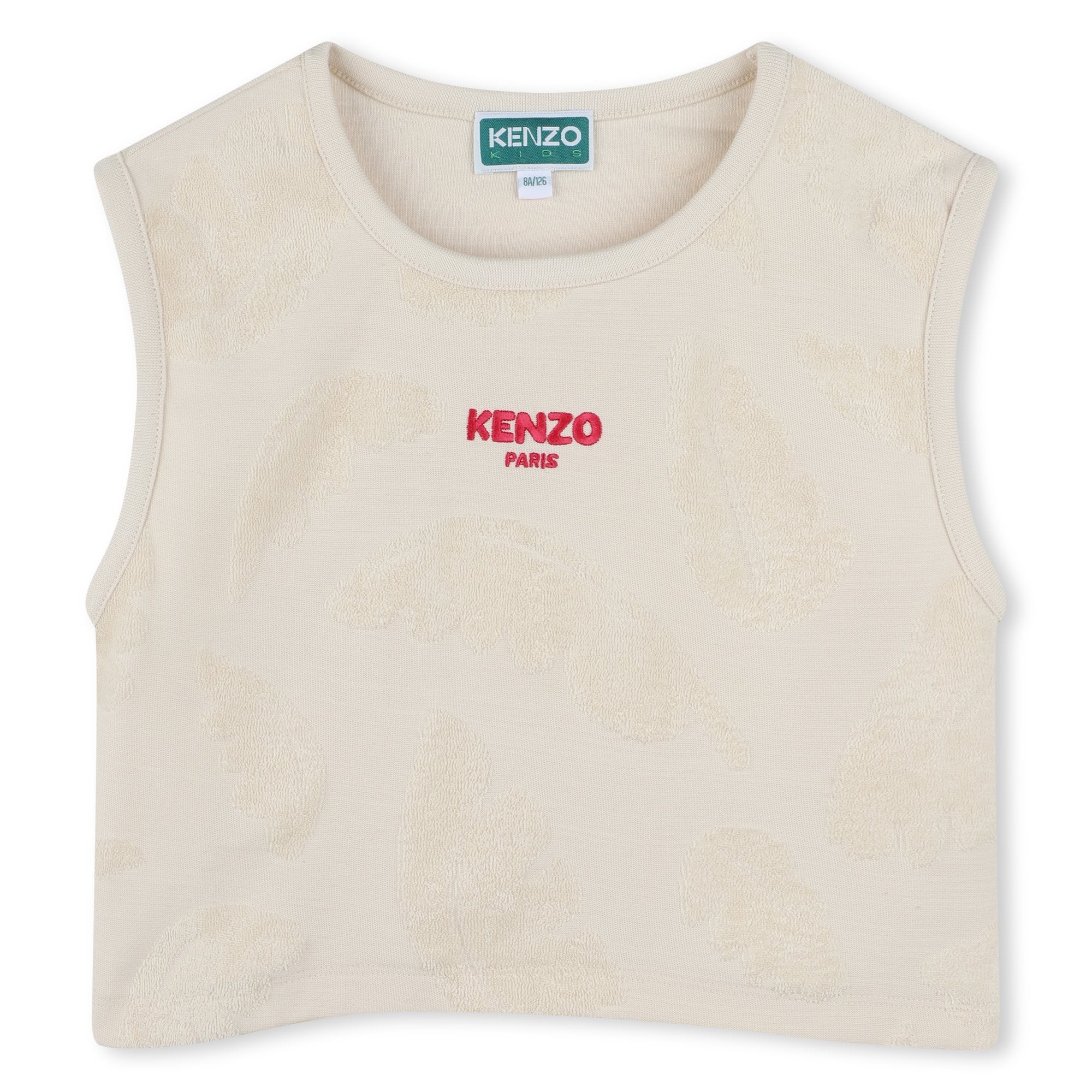 Das Kenzo - Kids Set besteht aus einem beigen Top und passenden Shorts, beide mit einem auffälligen roten Kenzo-Logo bestrick. Dieses Set kombiniert Komfort und Stil und ist ideal für warme Tage. Das weiche Material sorgt für ein angenehmes Tragegefühl.