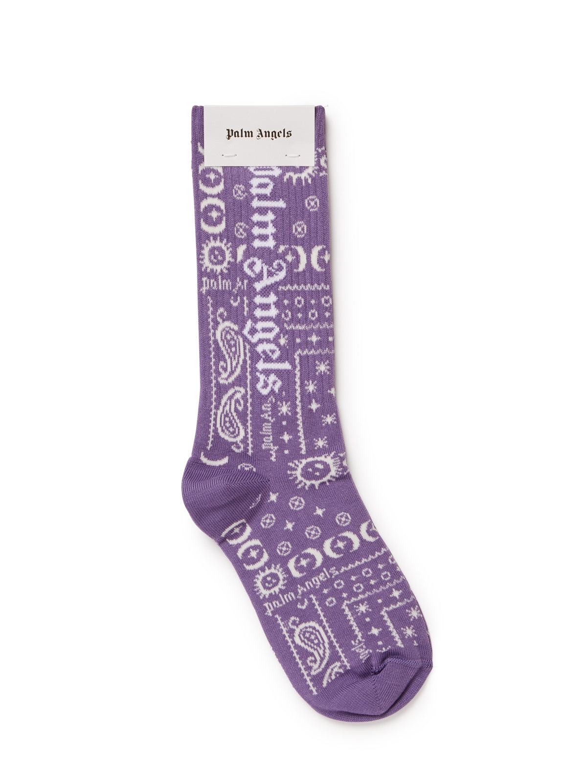 "Rocke deinen Look mit den Palm Angels Socken im "Bandana" Motiv in lila! Zeige deine wilde Seite mit diesen hohen Socken in auffälligem Paisley-Muster. Die perfekte Ergänzung zu jedem Outfit - egal ob casual oder edgy. Lasse dich von diesen Socken inspirieren und werde zum Star deiner eigenen Astroshow!"