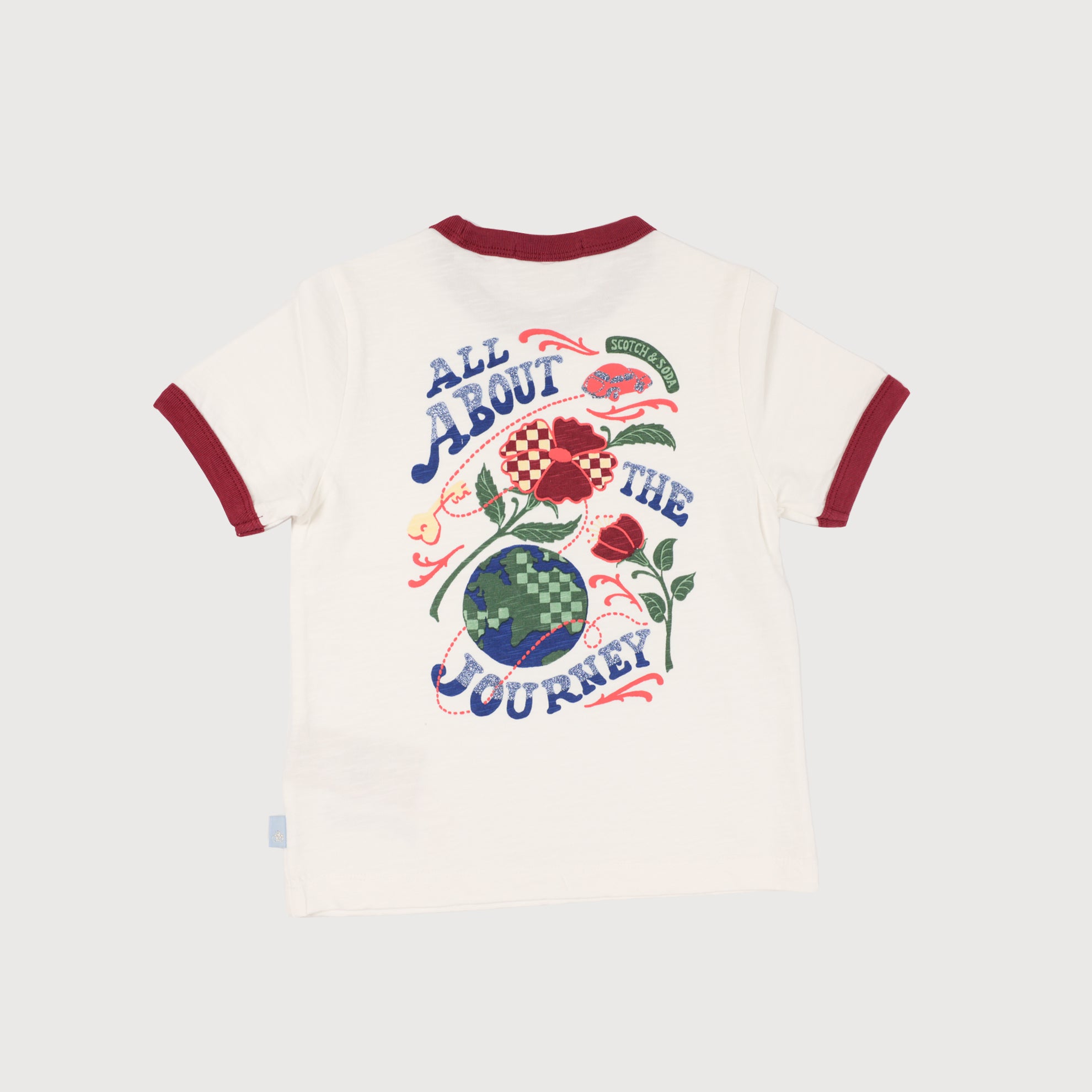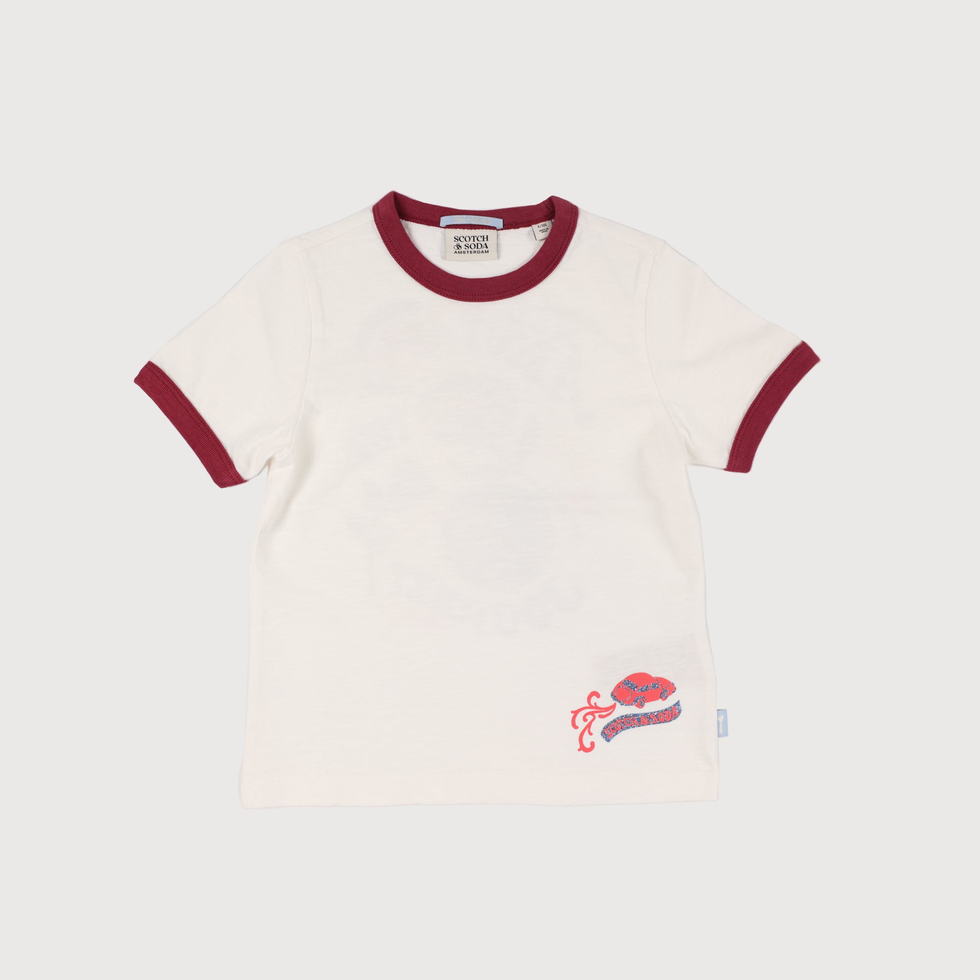 Hol dir jetzt das Scotch & Soda T-Shirt mit lustigem Druck auf der Rückseite und roten Nähten an Ärmeln und Halsausschnitt. Perfekt für freche Kids mit Sinn für Humor!